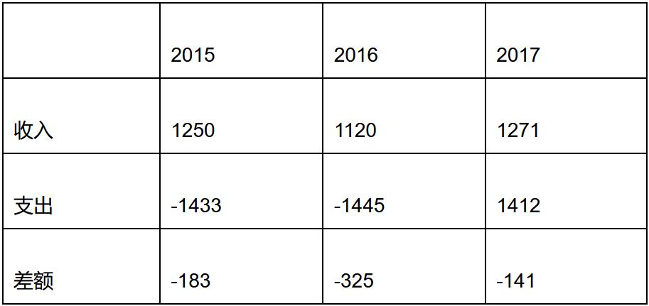 【财政金融】 财政困难,连年赤字。近年财政收支情况如下(单位:亿非洲法郎):