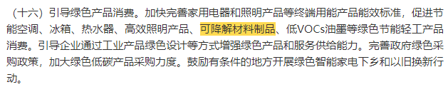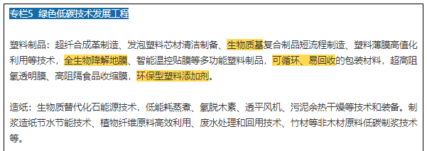 2022年6月17日,工业和信息化部、人力资源社会保障部、生态环境部、商务部、市场监管总局联合发布《关于推动轻工业高质量发展的指导意见》,明确提出发展生物质新材料、全生物降解地膜等材料低碳技术发展工程及可降解材料制品的绿色产品消费。
