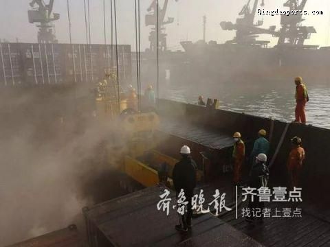 救援行动按照方案紧张有序推进,舱盖下的3个冒烟情况较轻的集装箱也由桥吊设备依次顺利吊离船舱,并移至岸上成功灭火扑救。